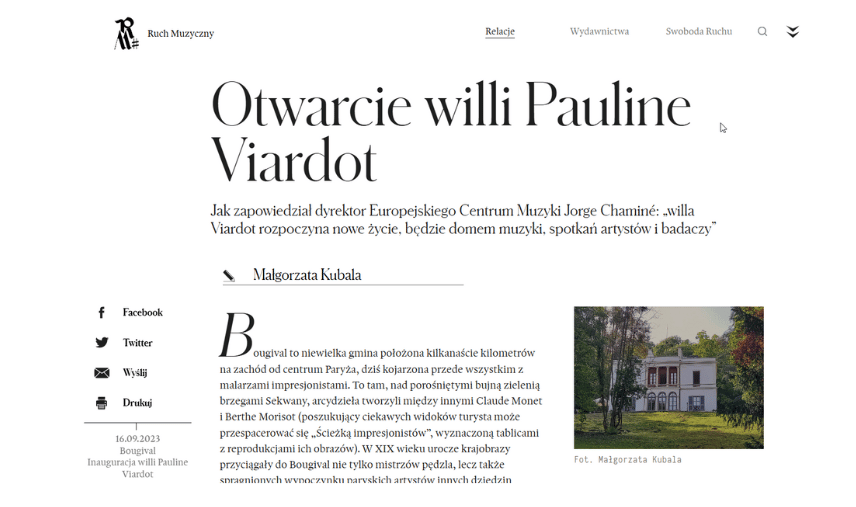 Artículo: Inauguración de la Villa Pauline Viardot (título original: Otwarcie willi Pauline Viardot)