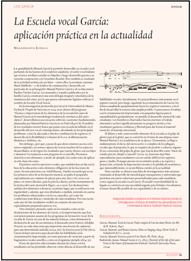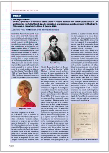 Referencia: Cieśla, R., Kubala, M., & Muszyńska-Andrejczyk, A. (2023). Szkoła belcanto Manuela Garcíi Seniora : Geneza, problematyka, kontynuacja, recepcja w wokalistyce współczesnej. Uniwersytet Muzyczny Fryderyka Chopina, págs. 53-72.