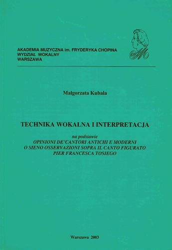 Referencia: Kubala, M. (2003). Technika wokalna i interpretacja na podstawie “Opinioni de’cantori antichi e moderni o sieno osservazioni sopra il canto figurato Pier Francesca Tosiego”. Wydawnictwo AM., 116 págs.